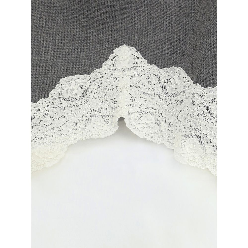The midi wool and lace Skirt by Jil Sander embodies refined contemporary elegance. Crafted from wool canvas with lace inserts and an organza hem, it features a straight cut and a slightly high waist that subtly enhances the silhouette. The back zip fastening and strap detailing add a distinctive tailored touch, while the viscose lining ensures comfort and a flawless fit. A piece that combines precious textures with minimalist precision, true to Jil Sander’s aesthetic.